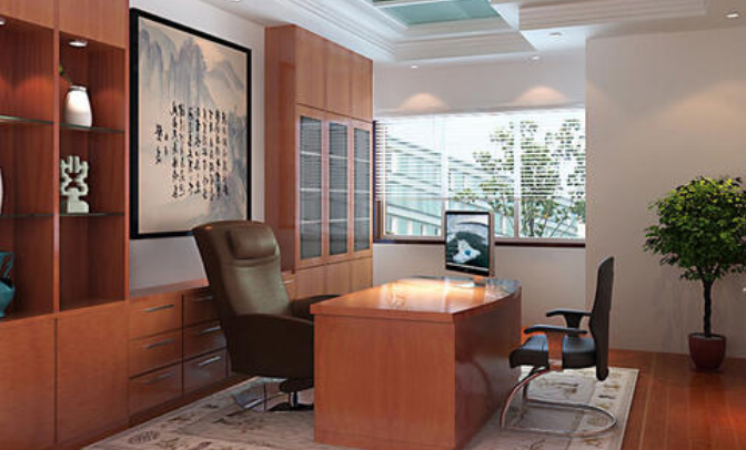 人坐在辦公桌后,背后要有靠,這個(gè)靠可以是墻壁,也可以是比較大的柜子,最忌背后是門。如果背后是通透的窗戶,就要把窗戶進(jìn)行遮檔,背后的裝飾畫也要以靜態(tài)的山、樹等為好。