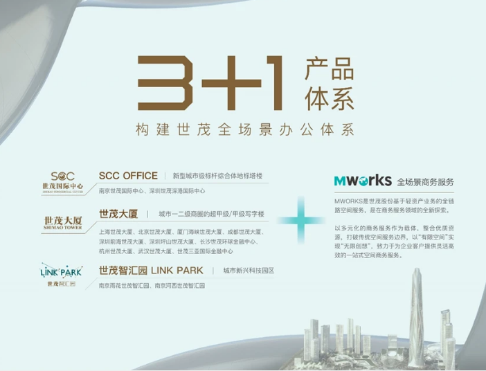而世茂寫字樓提供的信息顯示,在產(chǎn)品端,其已形成“3+1”產(chǎn)品體系,涵蓋SCC office、世茂大廈、世茂智匯園等三大寫字樓品牌,以及為員工、企業(yè)、業(yè)主、城市打造的“MWORKS全場景商務(wù)服務(wù)”品牌,“整體構(gòu)成了世茂寫字樓的全場景辦公體系”。