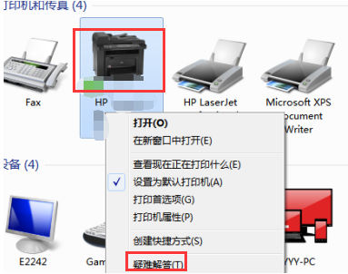 2、選擇有故障的打印機的名稱,鼠標右鍵點擊打印機的名稱,然后點擊“疑難解決”,如下圖所示。