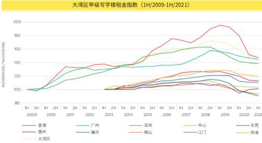 以大灣區(qū)甲級寫字樓近年來的租金指數(shù)為例,從上圖可以看出,從2009年到2019年,香港、廣州、深圳等城市的租金指數(shù)整體呈上升趨勢,2020年上半年跌入低谷,從下半年開始復(fù)蘇。