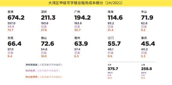地段好也意味著租金高,第一太平戴維斯數(shù)據(jù)顯示,2021年上半年中國甲級寫字樓租金最高的城市為香港,每平方米總租用成本高達(dá)674.2元,其中租金557元,物業(yè)管理費(fèi)72.7元,相關(guān)稅費(fèi)44.6元;參考北京甲級寫字樓租金為341.3元/平方米,上海為223.5元/平方米。