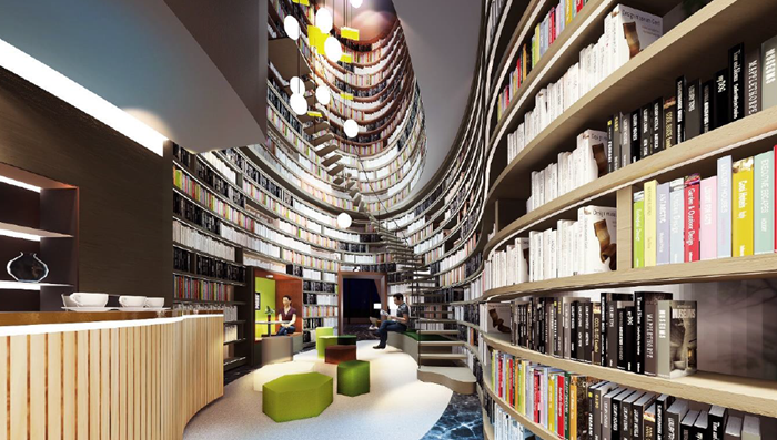 10米層高的巨幅書墻、旋轉(zhuǎn)而上的階梯,人與人、人與書、樓體與書架、書架與空間,相互交融,在這里享受工作之余的閱讀快樂。