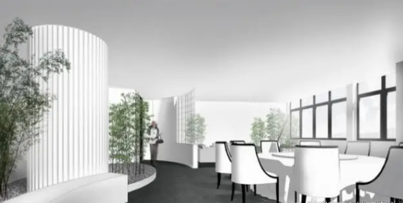 園區(qū)內(nèi)2號樓為園區(qū)配套,包括接待大廳、書吧、大食堂、超市、茶吧、西餐廳、自助餐廳、廂式餐廳、健身中心、個性化體驗式員工公寓套房14間和標準房60間。