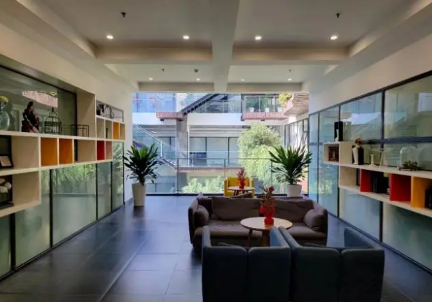 虹橋德必易園由A、B兩座相連樓宇組成,總面積25000平方米。1-4層為商業(yè)配套,5-8層為創(chuàng)意辦公區(qū)。在設(shè)計(jì)上,園區(qū)秉承《易經(jīng)》簡(jiǎn)與變的精神,為企業(yè)提供園林式生態(tài)辦公體驗(yàn)。園區(qū)突破性地采用樓內(nèi)中部鏤空的結(jié)構(gòu)形式,在樓體內(nèi)部開辟出一塊垂直花園,綠化垂直層疊而上,辦公其中猶如置身自然,既保證了辦公區(qū)域光線的通透感,又形成特有的生態(tài)圈。對(duì)于文化創(chuàng)意人群的原創(chuàng)精神,客戶可以在園區(qū)內(nèi)自由發(fā)揮創(chuàng)意,營(yíng)造個(gè)性化的辦公氛圍。
